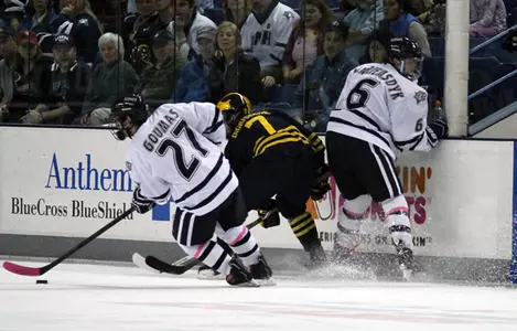 DURHAM, N.H. – Kevin Goumas (Long Beach, N.Y.) scored two goals, but the 13th-ranked University of New Hampshire men's ice hockey team was defeated 3-2 in overtime by fifth-ranked University of Michigan on Saturday night at the Whittemore Center.